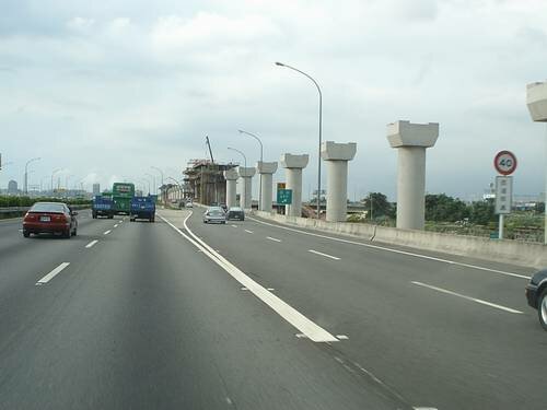| This is why it is so important to remain close-mouthed about things in your personal life. Although reprisals are uncommon against foreigners, they do occur. | Pylons for the new high speed rail system flank an expressway in Taichung. The project is a Japanese-style development program that will saddle the island with a useless economic stimulus project and Japanese-style debt. |