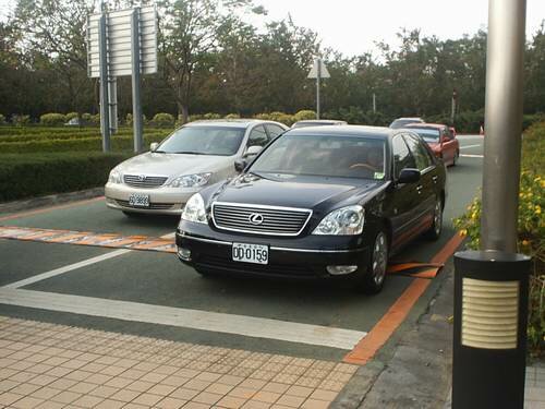 A common crime: this black car simply parks here, in the middle of an off-ramp for a highway rest stop, because it is closer to the bathroom. People with expensive vehicles often act as though they own the road. |